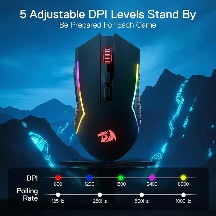 Equipped with five on-board DPI levels (800, 1200, 1600, 2400, and 8000), your mouse clicks can be mapped to each precise spot. Five DPI levels are available for free with DIY program, allowing players to quickly choose between them while playing.